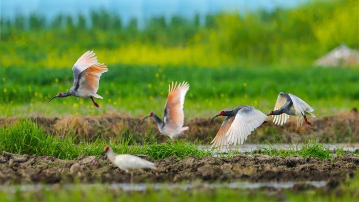 春日秦岭腹地美如画 朱鹮田间蹁跹觅食