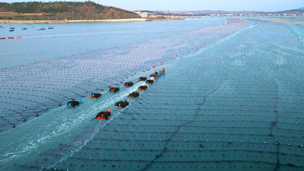 山东荣成:海上春耕忙 海带喜丰收