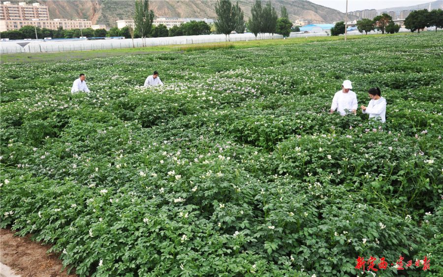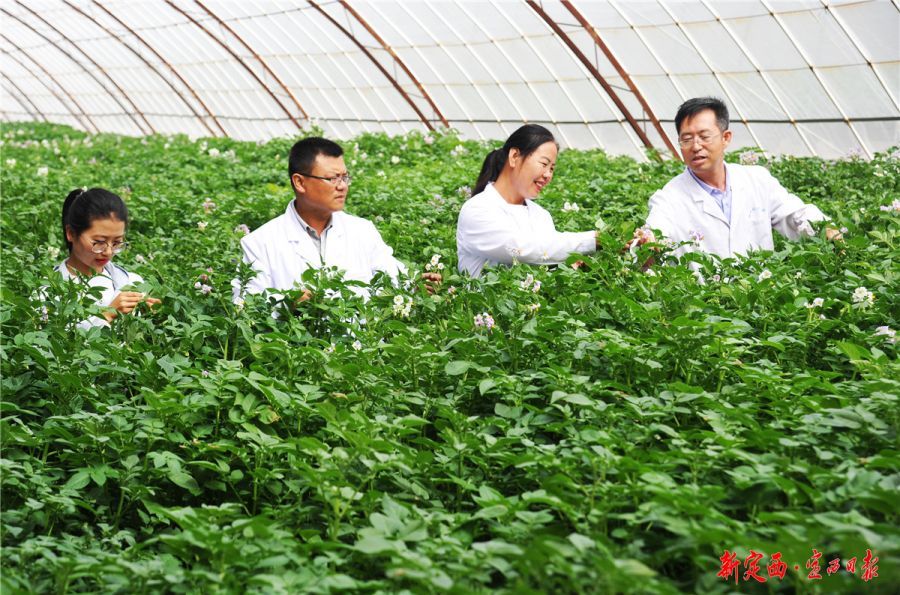 近年来,国家马铃薯产业技术体系定西综合试验站,结合我市自然条件,全力做好旱地区马铃薯新品种选育研究、引进筛选及脱毒种薯繁育,科技助力全市产业扶贫工作。图为国家马铃薯产业技术体系定西综合试验站科研人员在实验基地观察马铃薯的生长情况。 安铎 摄