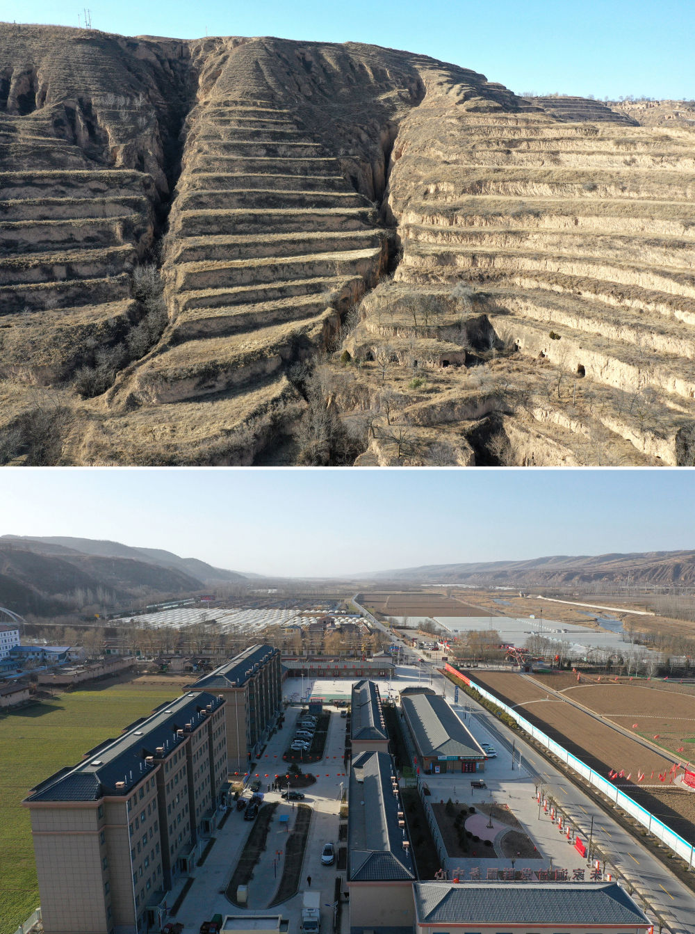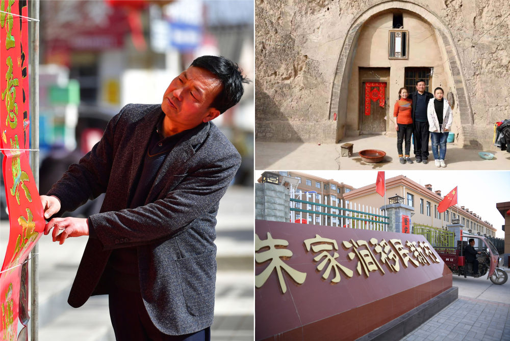 ▲这是一张拼版照片。上图:2月3日拍摄的朱惠平家过去在大山深处居住的窑洞;下图:2月3日拍摄的朱惠平家现在居住的朱家涧村易地扶贫搬迁安置小区的楼房。