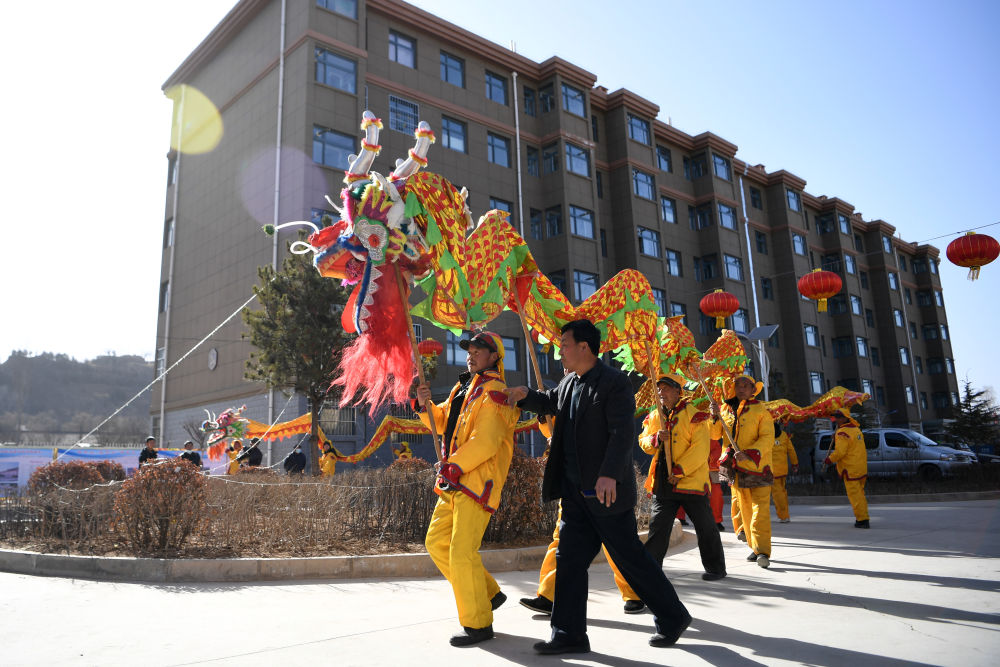 ▲2月3日,朱惠平(前右)组织村民进行舞龙舞狮彩排,迎接脱贫后的第一个春节。