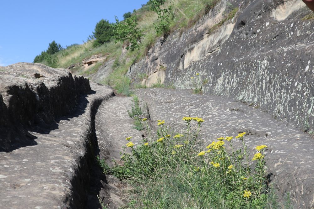 顺石阶攀岩而上,眼前忽现一道清晰可见的车辙。车辙印大约84米,车辙深0.25米。白京平说,石道上独轮车车辙印如此深长,必然需要很多车长年累月的碾压才能形成,可见当初这条丝路古道车水马龙,人烟兴盛。