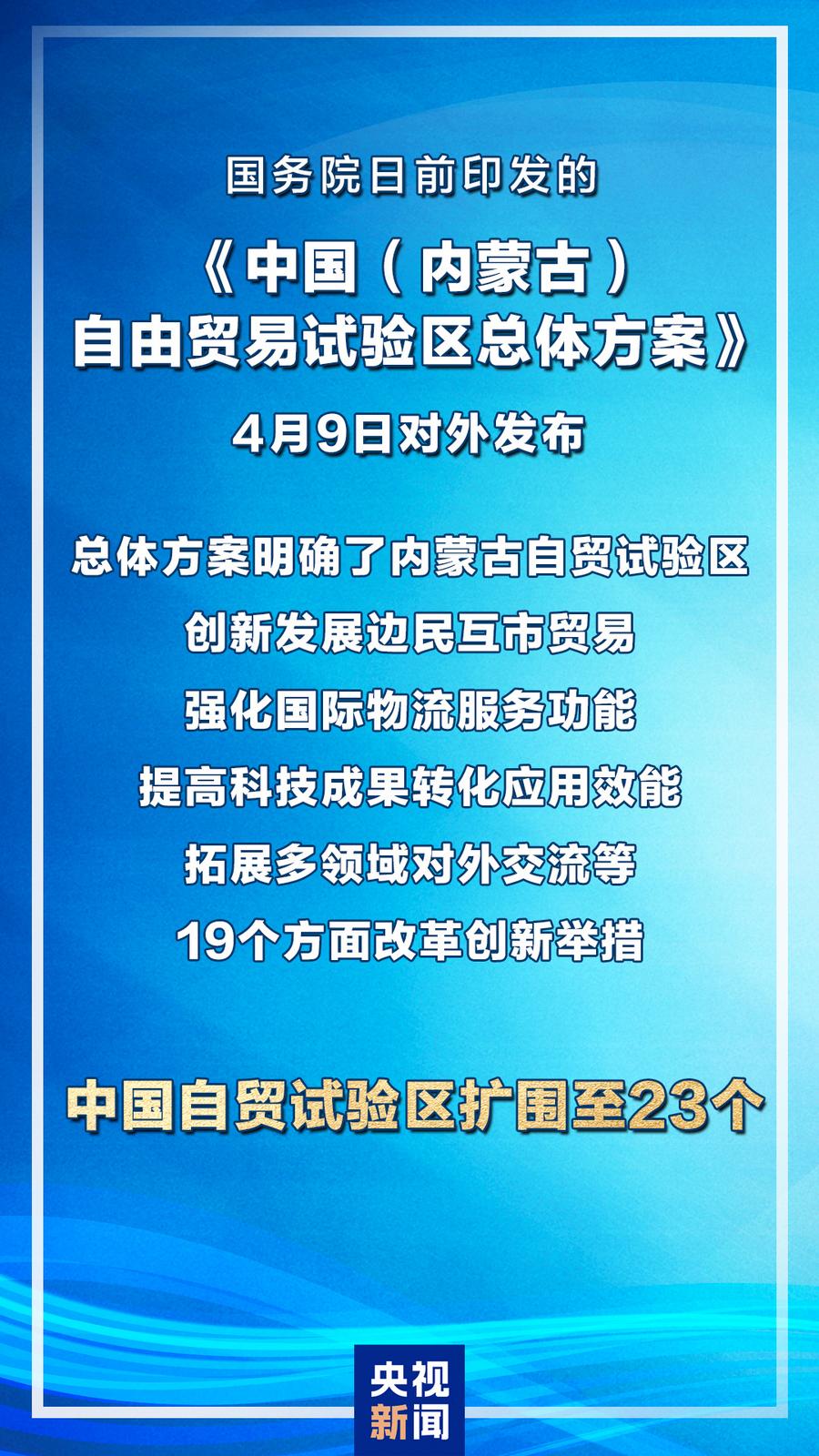 国务院日前印发的《中国(内蒙古)自由贸易试验区总体方案》4月9日对外发布。至此,中国自贸试验区扩围至23个。