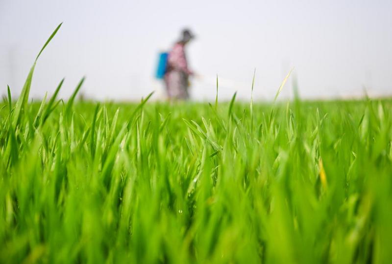 2026年3月20日,在河南省商丘市夏邑县曹集街道刘枣园村,村民在麦田内开展“一喷三防”作业。新华社发(王高超摄)